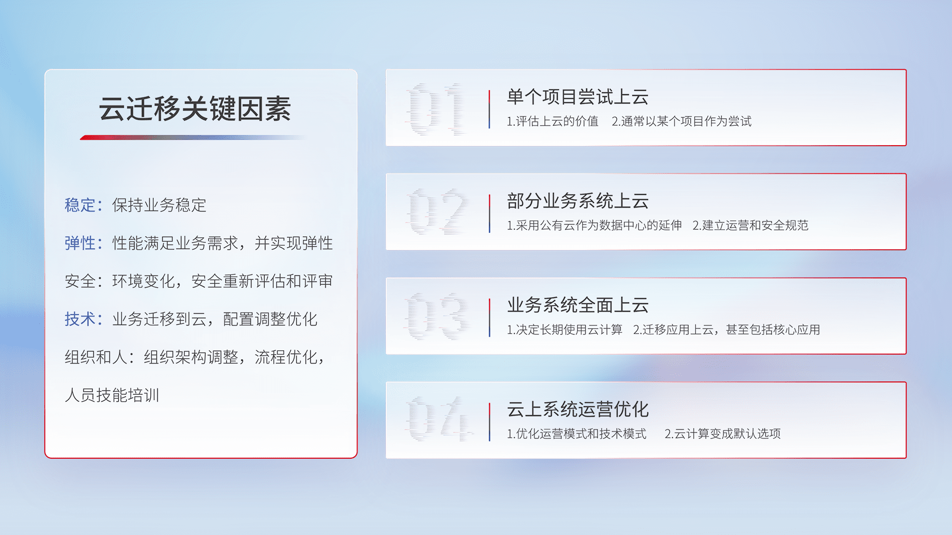 结合实际业务,,,,从规划设计、、云平台选型、、云原生改造、、、、数据迁移、、、、集成交付,,迁移全过程为客户识别最佳上云路径,,做好风险识别管理,,,,设计网络架构、、、、身份权限、、、安全审计合规、、、、操作审计、、日志审计、、监控告警策略、、、、多站点容灾设计等,,,,对云上基础设施进行整体规划,,提升IT治理水平,,,,以满足弹性、、高可用、、高性能的需求。。