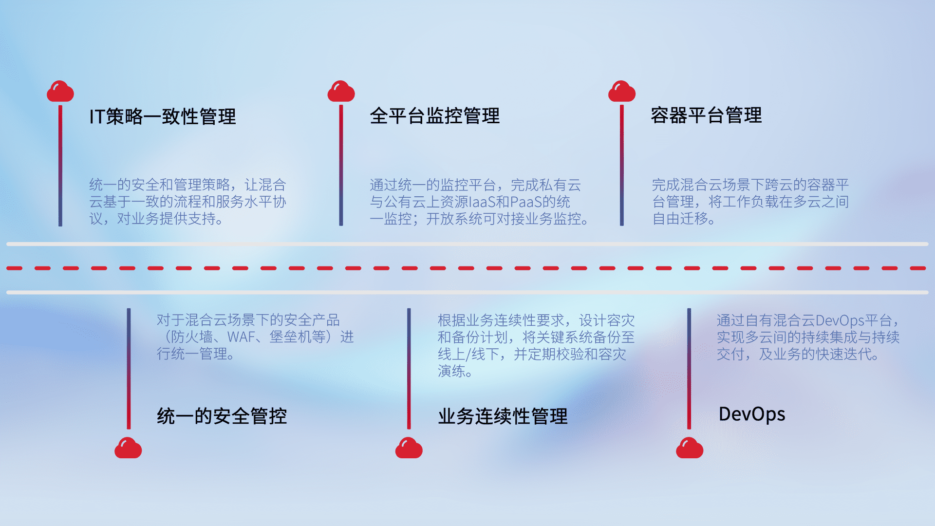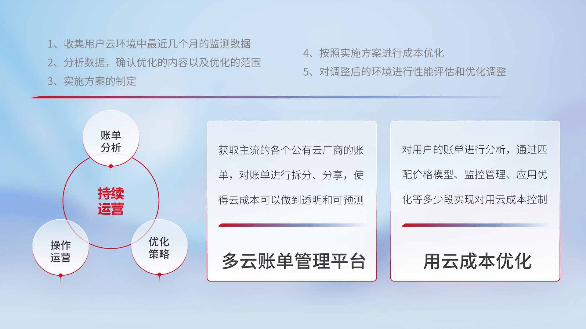 通过多云纳管,,,,以统一的资源数据模型把客户的云资源进行抽象和封装,,,进而实现对多云资源的统一操作,,,保障云资源管理的可靠性、、、、稳定性与可用性。。。量身定制化运维内容,,配置、、、开发运维、、、、补丁管理、、、、备份、、监控、、、认证和访问管理、、审计和日常巡检等,,,,保障在用云过程中的可靠度,,,,稳定度以及高可用率。。