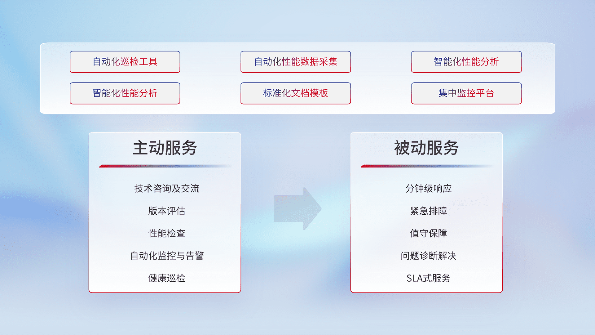 智能化工具和标准化文档,,,,保障服务质量,,,,提供主动服务(包含技术咨询、、、、版本评估、、性能检查、、、、自动化监控与告警、、、、健康巡检)和被动服务包含(分钟级响应、、、紧急排障、、、值守保障、、问题诊断解决、、、SLA服务)。。